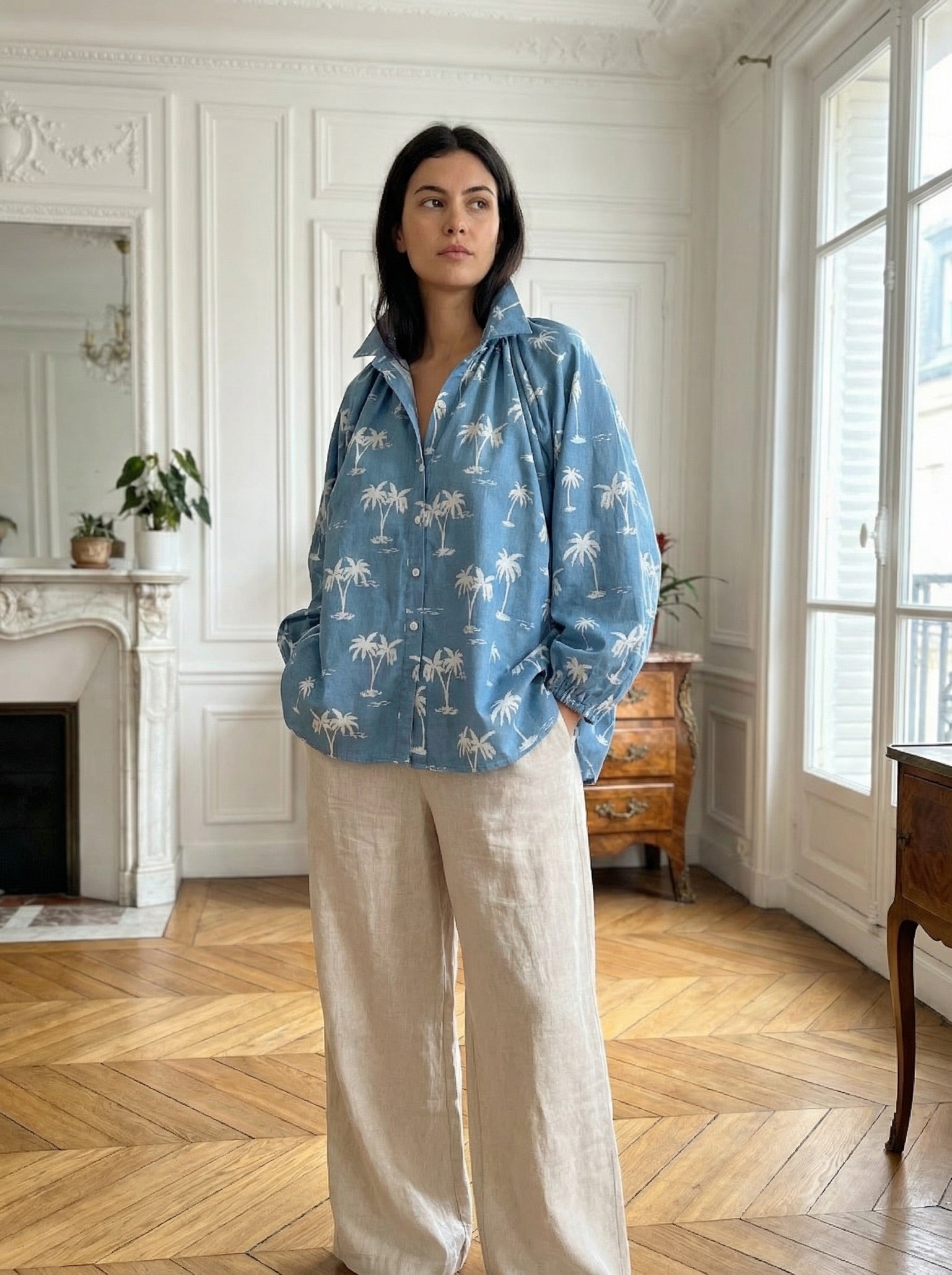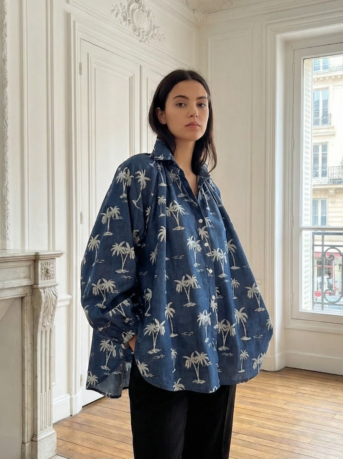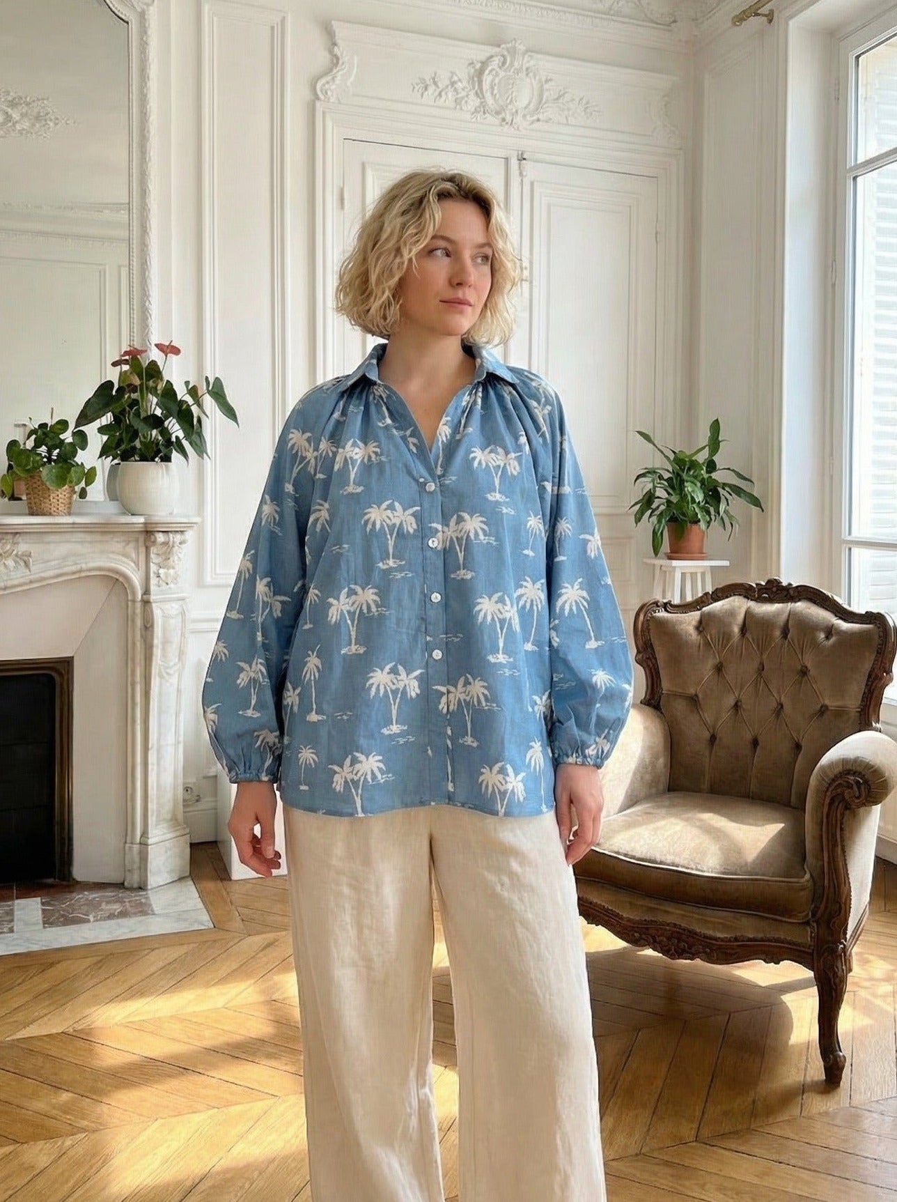 Effortlessly relaxed with a touch of coastal charm, this Palm Print Denim Shirt is your new go-to for easy, elevated styling. Crafted from soft, breathable denim, this piece features an exclusive palm tree print that brings a fresh, resort-inspired feel to your everyday wardrobe. The relaxed fit, classic collar, and button down front allow for endless styling. Wear it loose, tucked, or layered for that effortless boutique look.