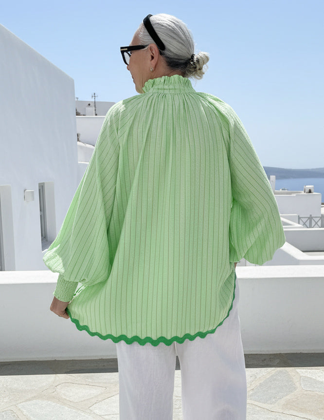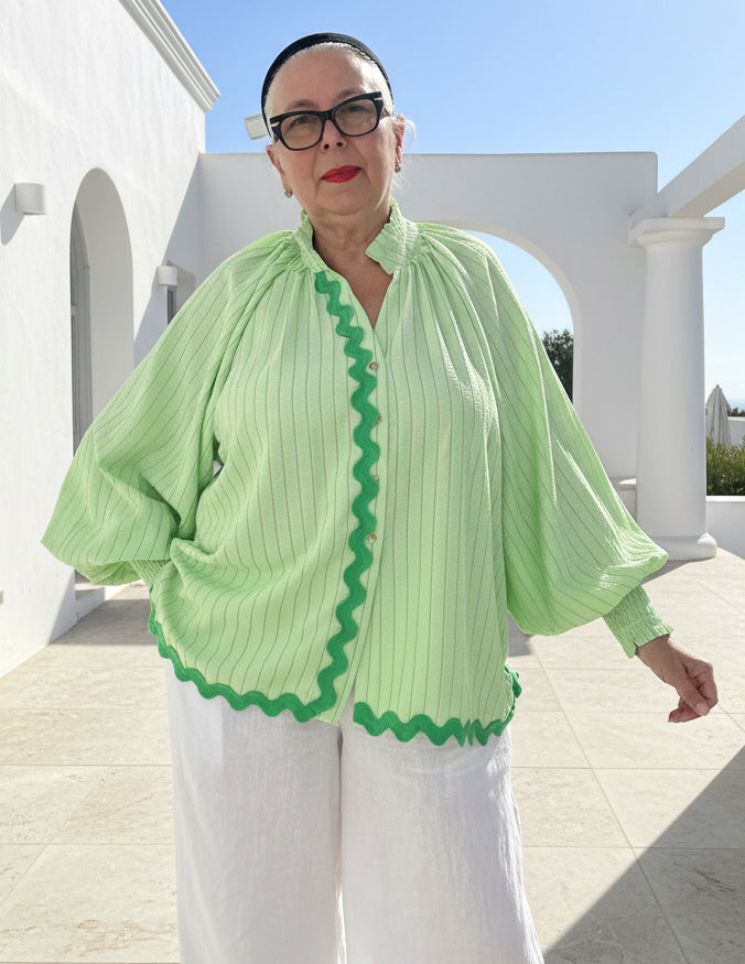 Add a pop of fresh color to your wardrobe with our new Wave Trim Shirt Shirt. Crafted from a soft, breathable cotton blend, this relaxed-fit dress is perfect for effortless everyday style. Featuring a classic shirt collar and signature wavy trim detail down the front and hem, this shirt brings a fresh pop of personality to your everyday look.