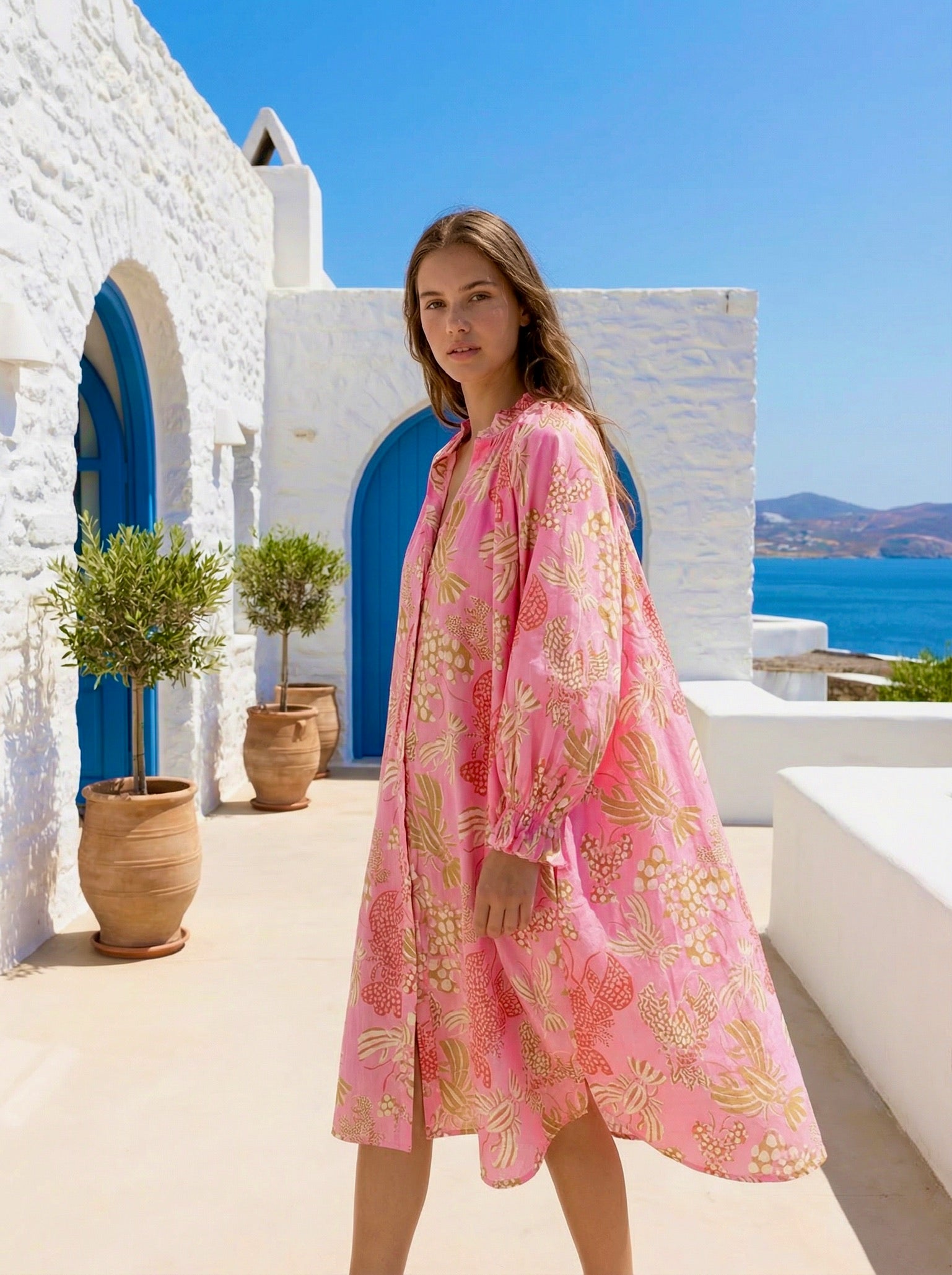 Made from a soft and airy linen blend fabric, offering both comfort and a naturally textured look. The dress features a flattering button-down front, relaxed sleeves with a modern loose fit that drapes beautifully on the body.