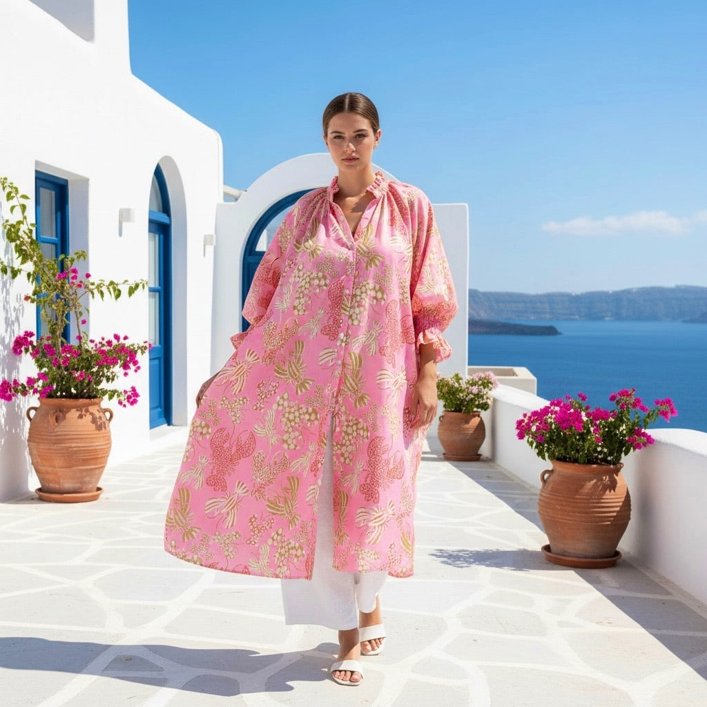 The vibrant lobster motif print adds a playful yet sophisticated touch, making it ideal for holiday styling, beach side lunches, or effortless everyday wear.