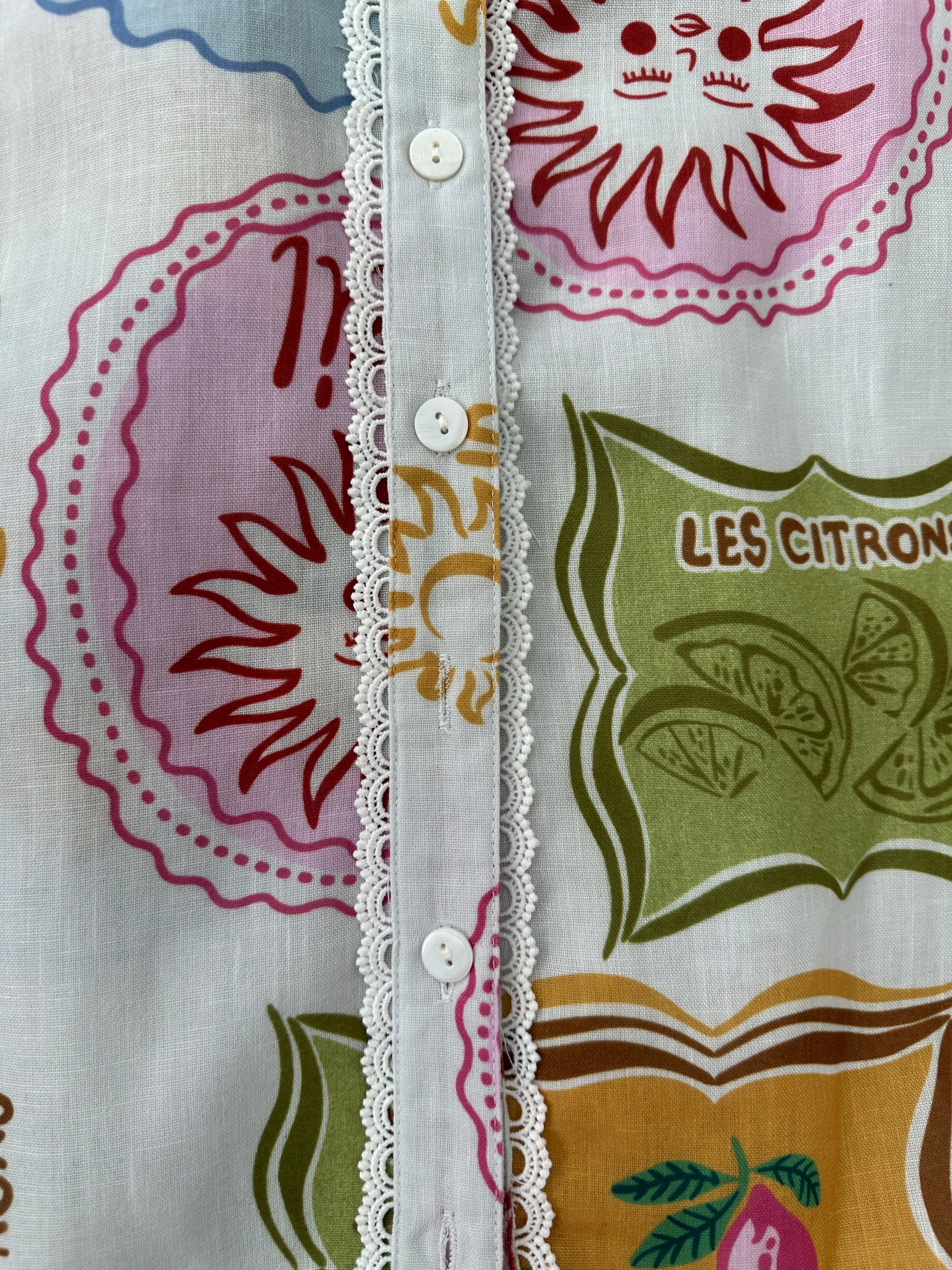 Bring a fresh Mediterranean feel to your collection with our new vibrant printed dress. Crafted from a breathable linen blend, this style features an all over patchwork print with playful fruit motifs and subtle Italian inspired details. Designed in an easy, relaxed silhouette, it offers a comfortable fit with 3/4 sleeves, a button through front and a mandarin collar is perfect for warm-weather styling.